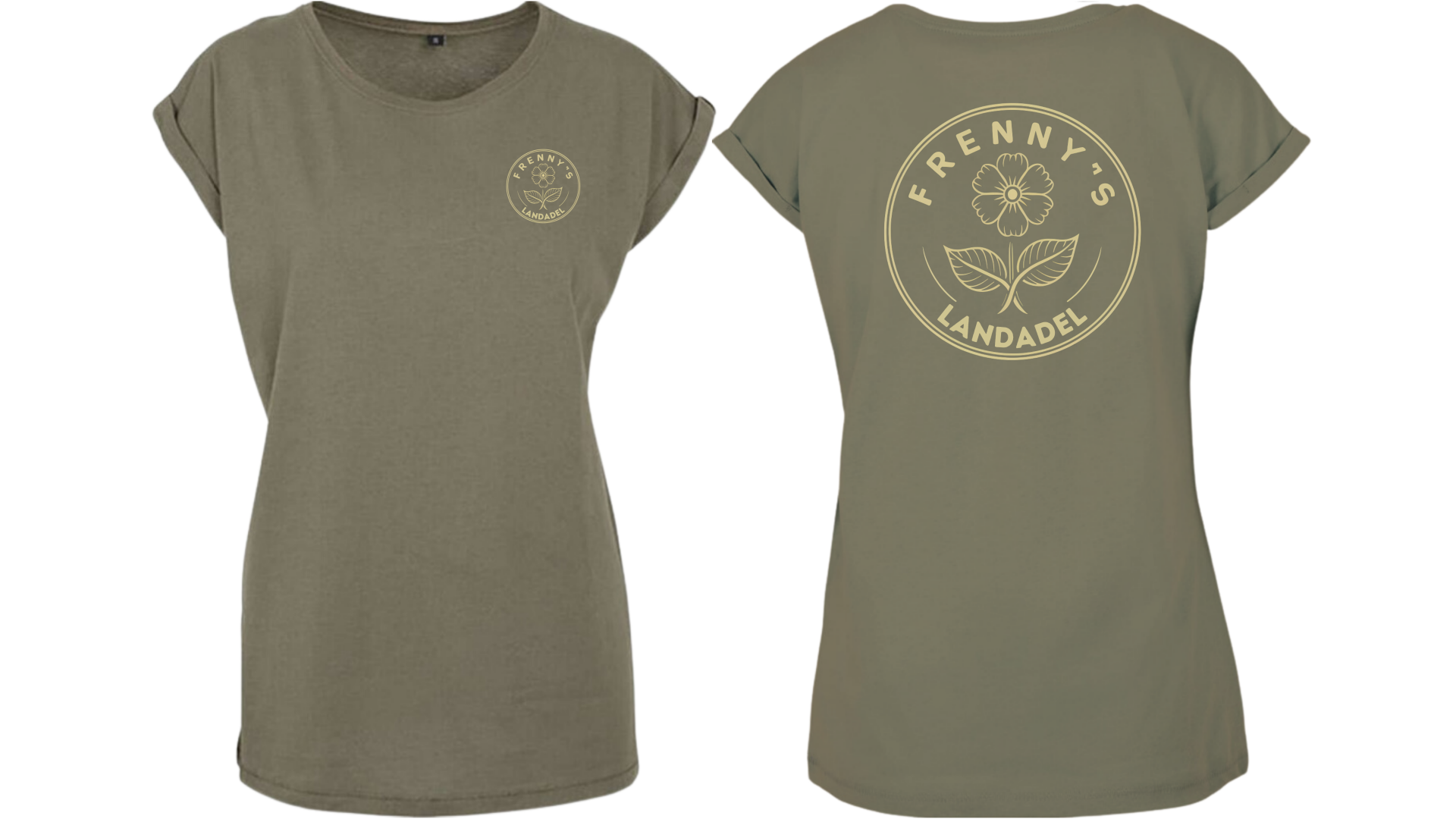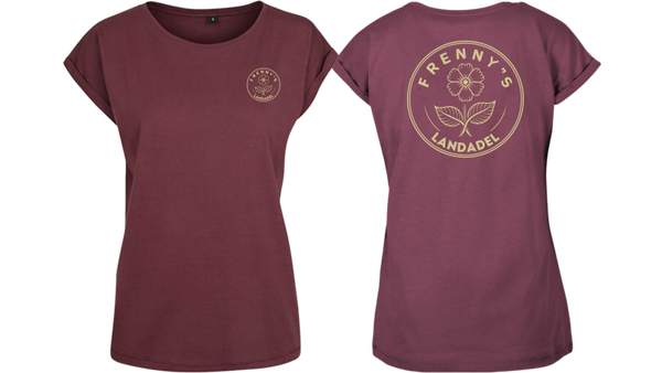 Weit geschnittenes olives oder cherry farbenes Girlieshirt mit großem Druck auf dem Rücken und einem kleinen auf der Brust.